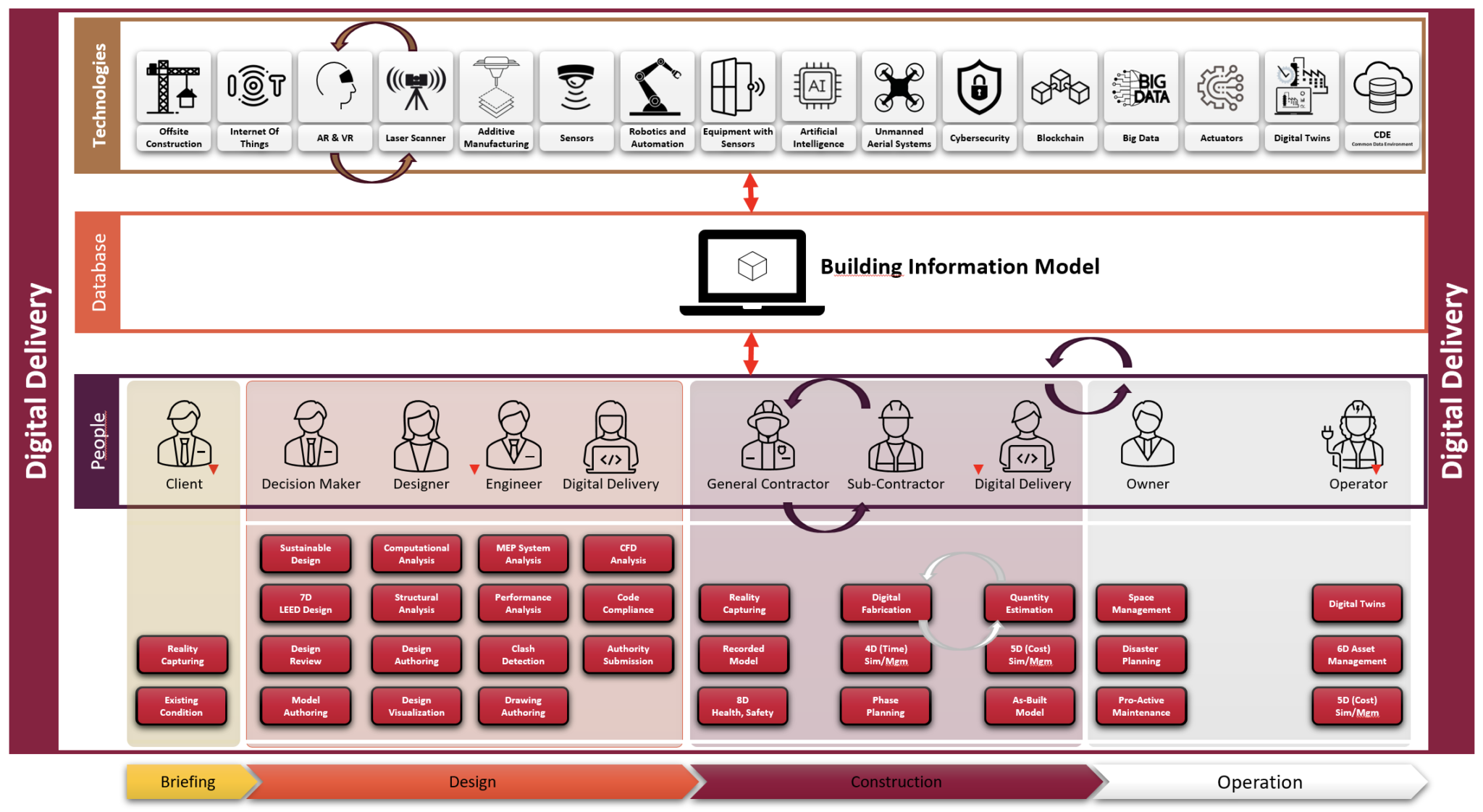 Share Digital Information through Building Information Modeling to allow the integration of the entire project delivery process such as Digital Design, Digital Manufacturing, Digital Construction, and Digital Asset Management through the single source of truth.
